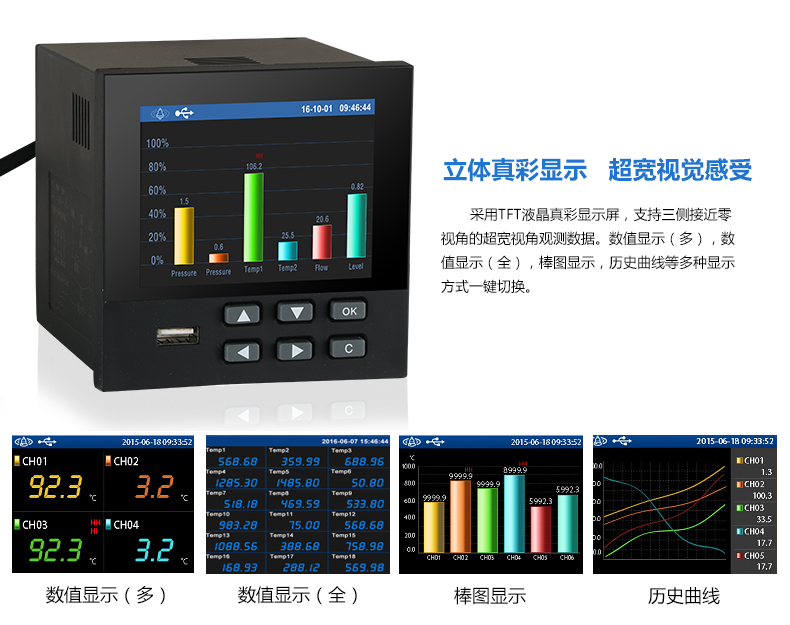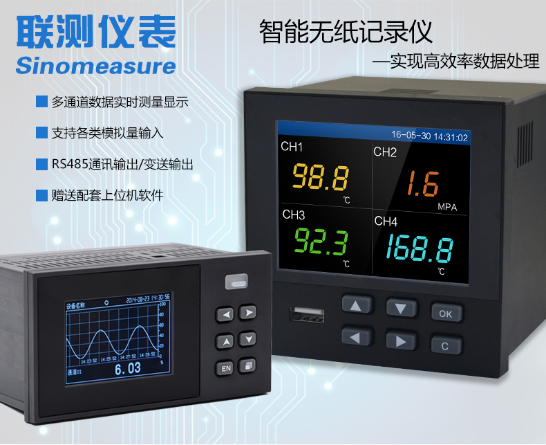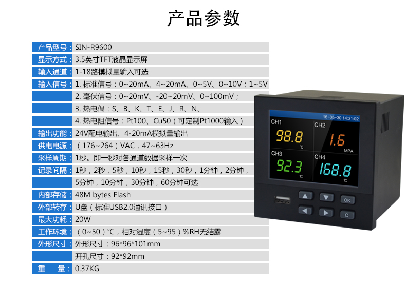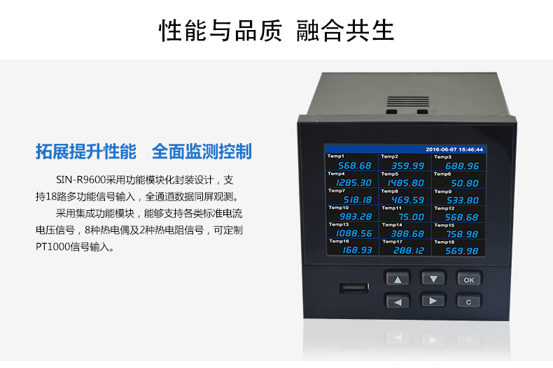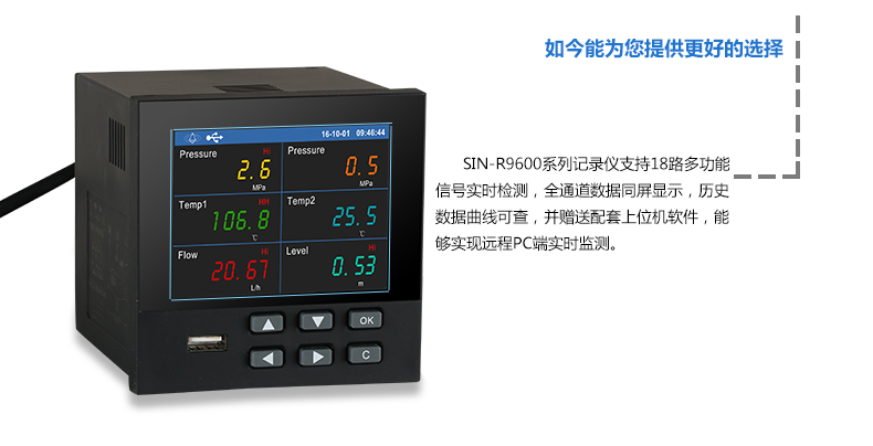 产品简介:SIN-R9600无纸记录仪内部采用高速、高性能32位cortex-M4微处理器。电路板经过“防腐、防潮、防尘”三防涂覆处理。高性能仪表电源有强大的抗干扰能力,能有效抑制外部谐波干扰,大大提高了整机的稳定性。