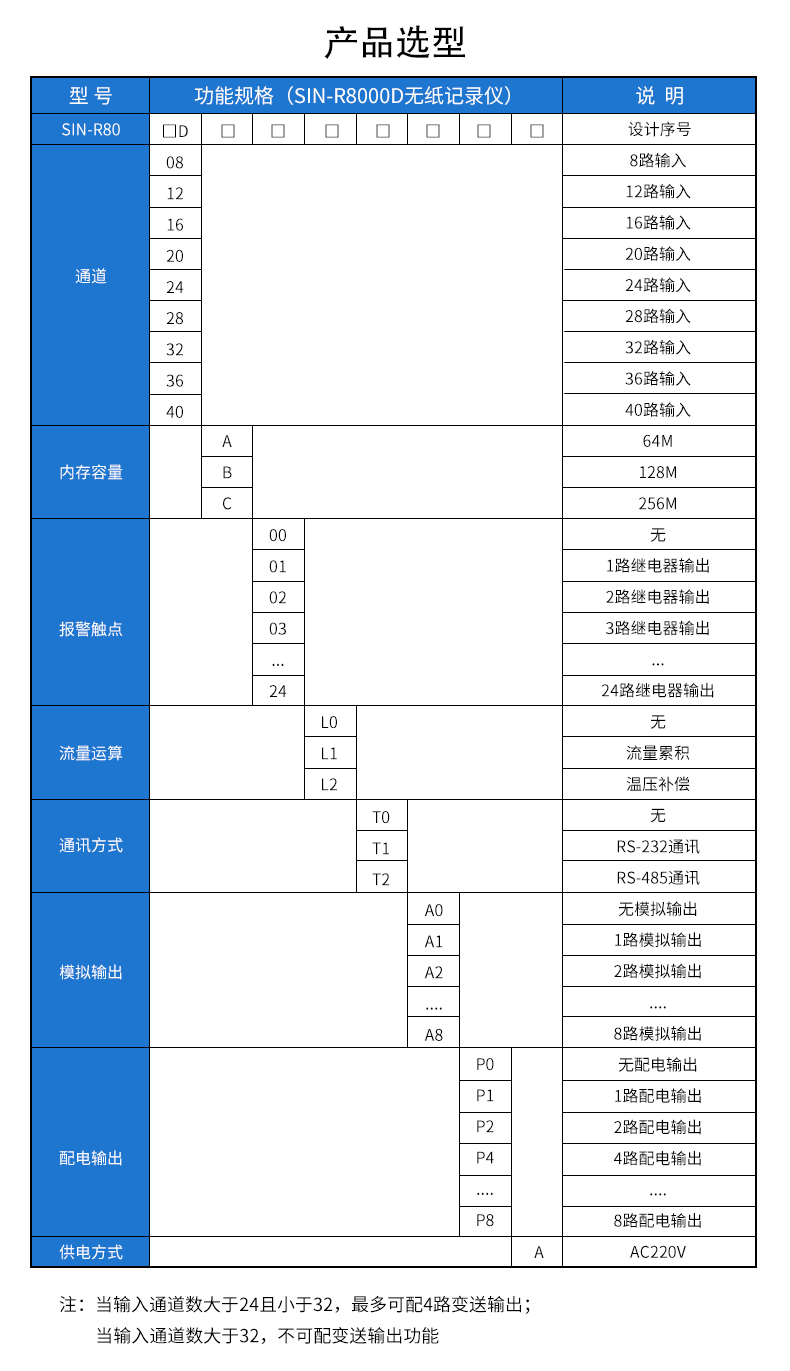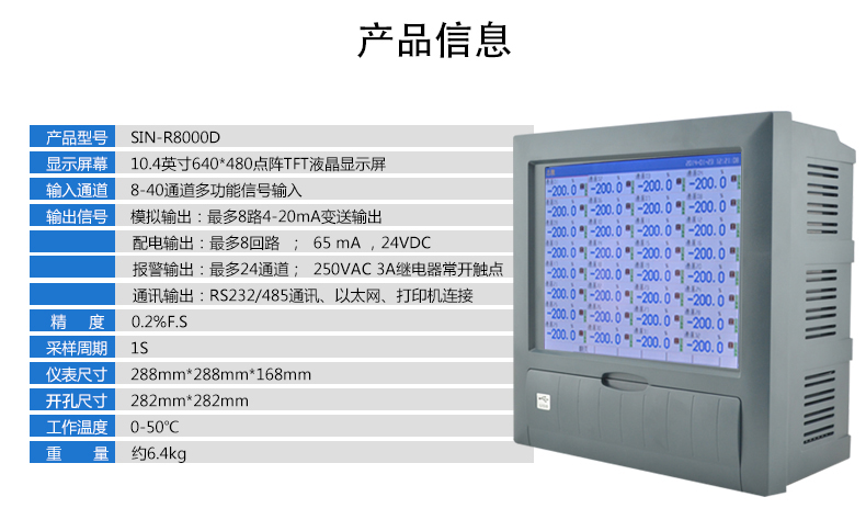 产品简介:SIN-R8000D系列无纸记录仪采用高速、高性能32位ARM微处理器,可同时实现40路信号采集,具有传感器隔离配电输出、继电器报警输出、变送输出、流量积算、温压补偿、累积报表、历史数据转存、打印以及远程通讯功能。