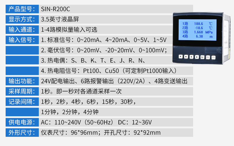 产品简介:SIN-R200C显示采用 3.5 英寸 高分辩率点阵式白屏黑字液晶屏,软件上引入中文WINDOWS 的框架思路,并采用了数据压缩技术。带 USB 数据转存功能,存储时间最长可达 720 天。仪表全面采用了表面贴装工艺,并采用多保护和隔离设计,抗干扰能力强,可靠性高。仪表可同时输入 4 路万能信号,输入通道相互隔离,并具有报警控制、模拟变送、RS485/232 通讯等输出功能,是一款功能齐全的汉显仪。