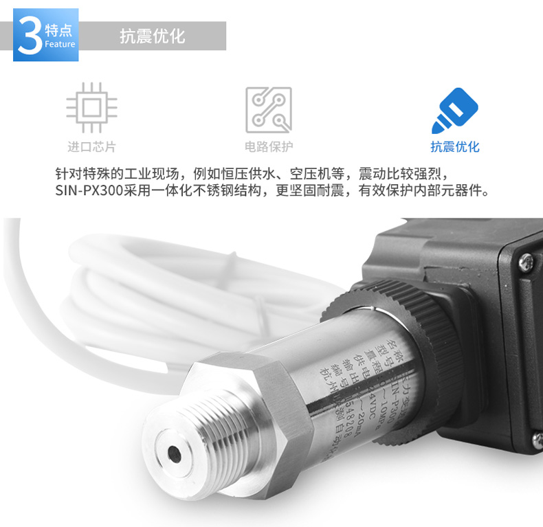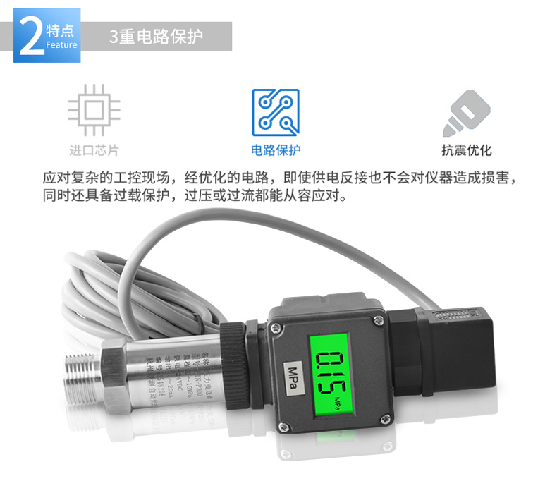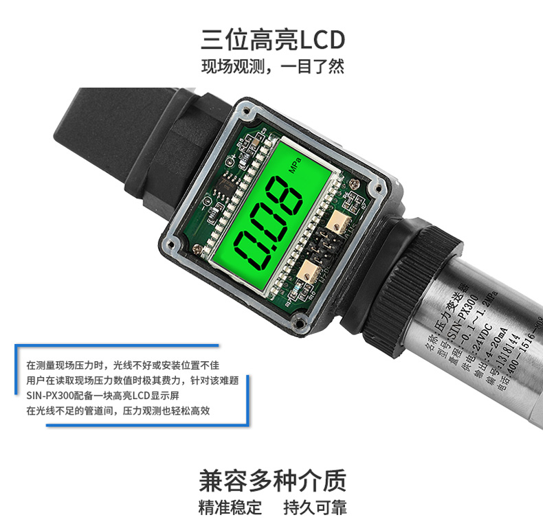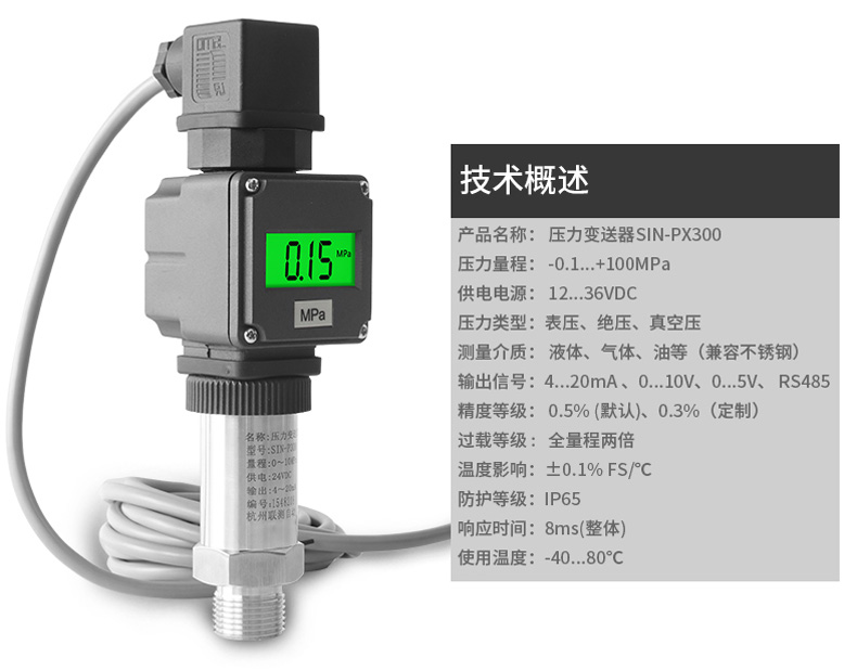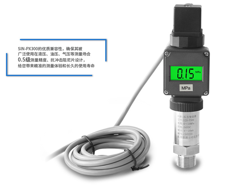产品简介:SIN-PX300型数显压力变送器采用无缝焊接结构,可批量化生产,经济、可靠,具有良好的适应性,可应用于各种复杂的环境,该产品输出形式多样,压力接口可提供定制,满足您的使用需求。同时数显压力变送器带有现场显示功能,能够更加直观的显示现场的压力波动情况。广泛应用于工业自动化设备配套以及石油、化工、冶金、电力等控制领域。