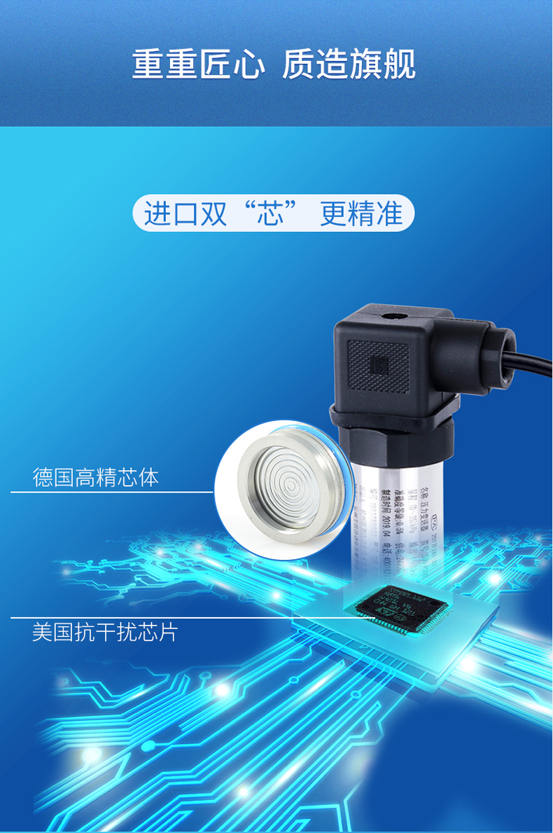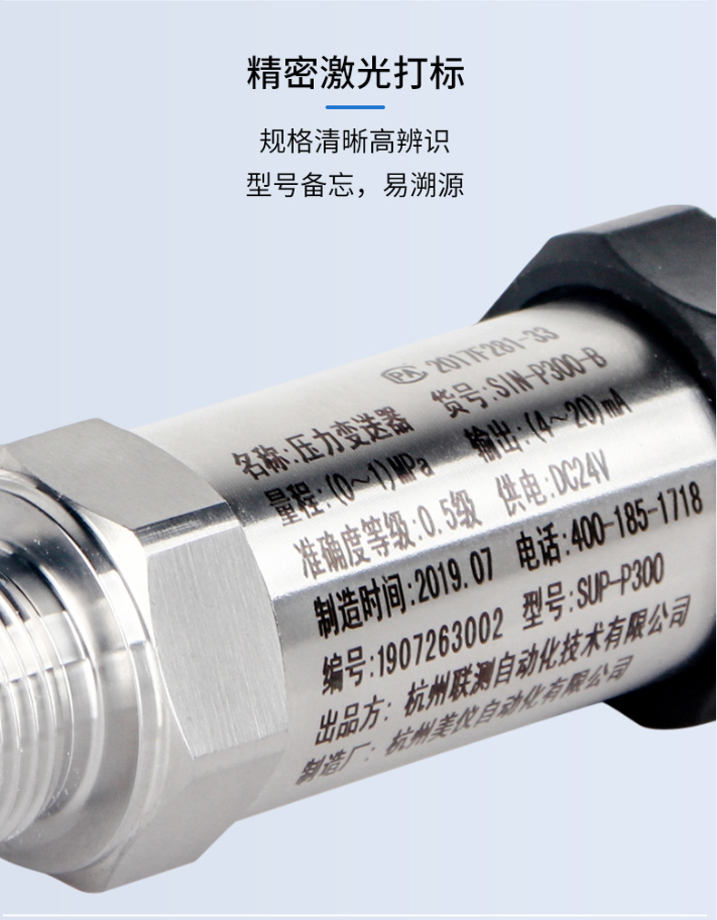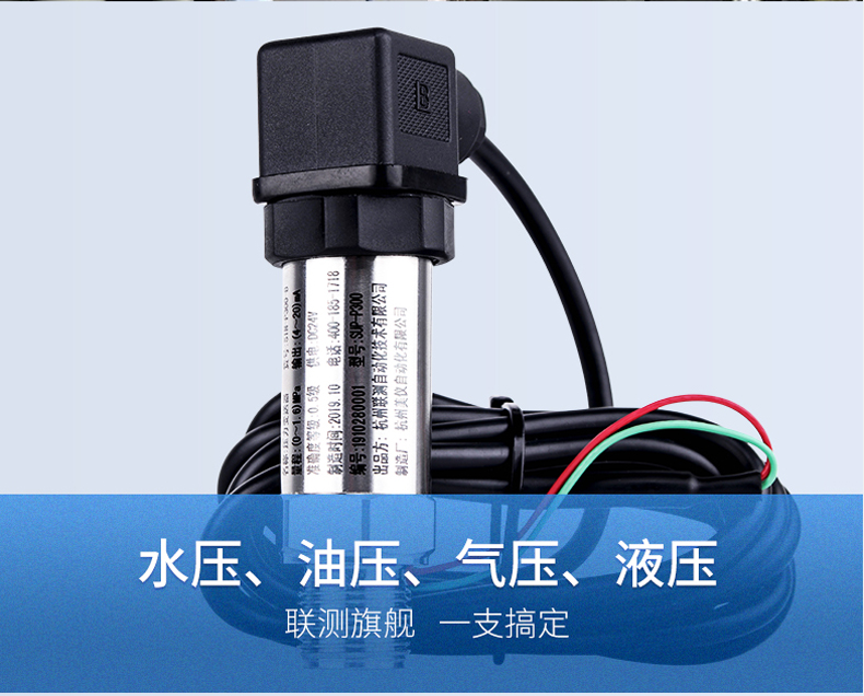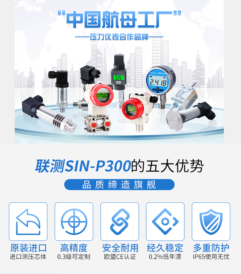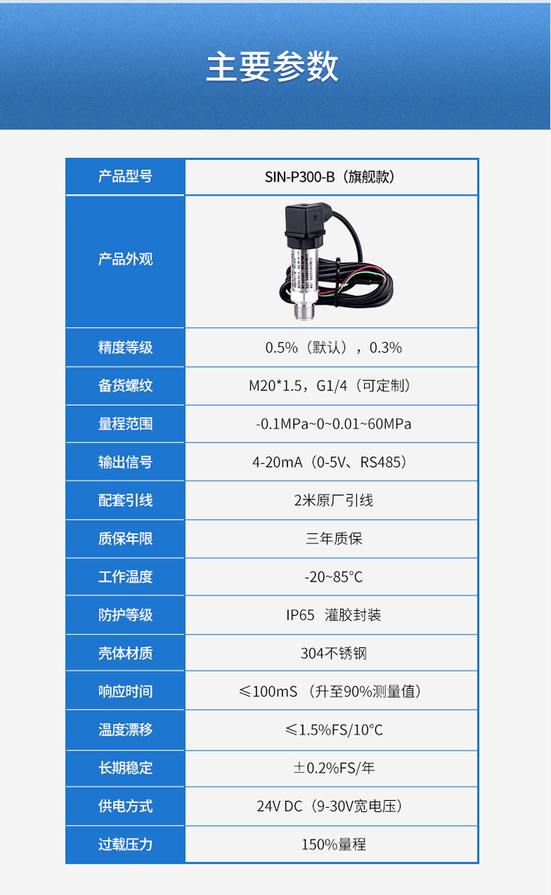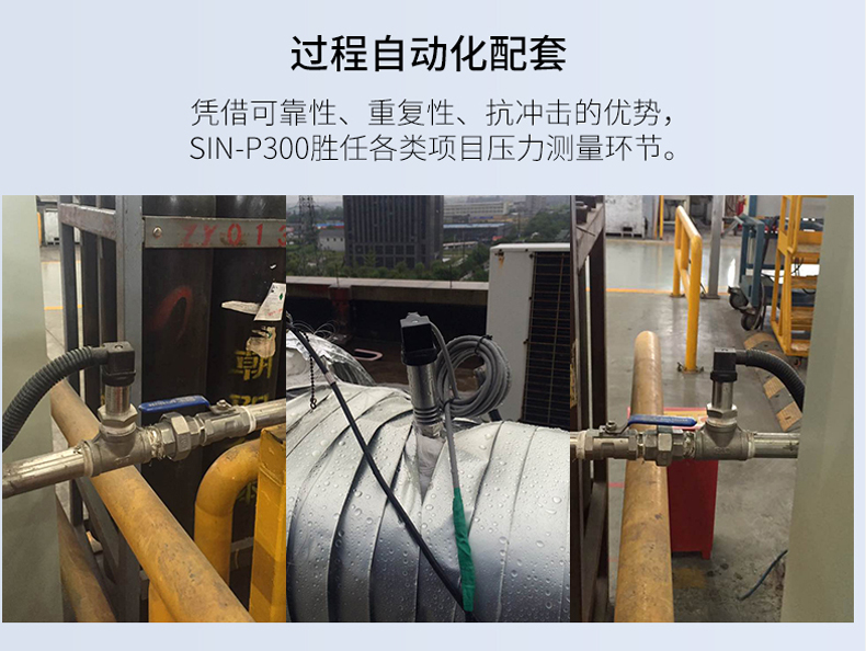 产品简介:SIN-P300通用型压力变送器德国进口硅芯片,精度高性能稳定;SIN-P300型通用型压力变送器采用扩散硅压力芯体作为敏感元件,内置处理电路将传感器毫伏信号转换成标准电压﹑电流信号输出,可直接与计算机、控制仪表﹑显示仪表等相连。