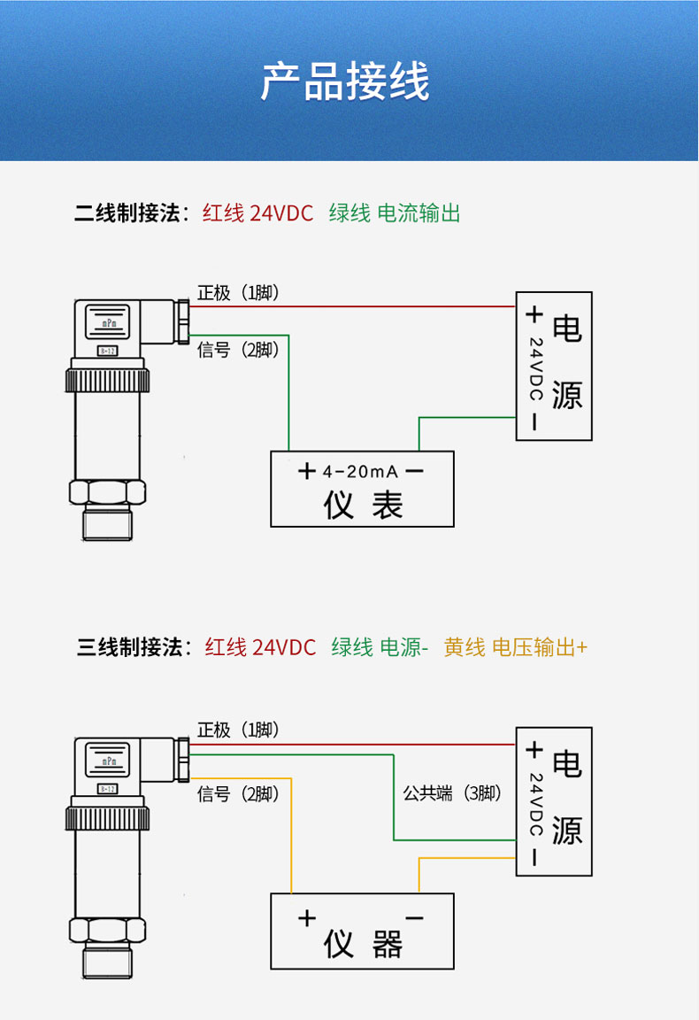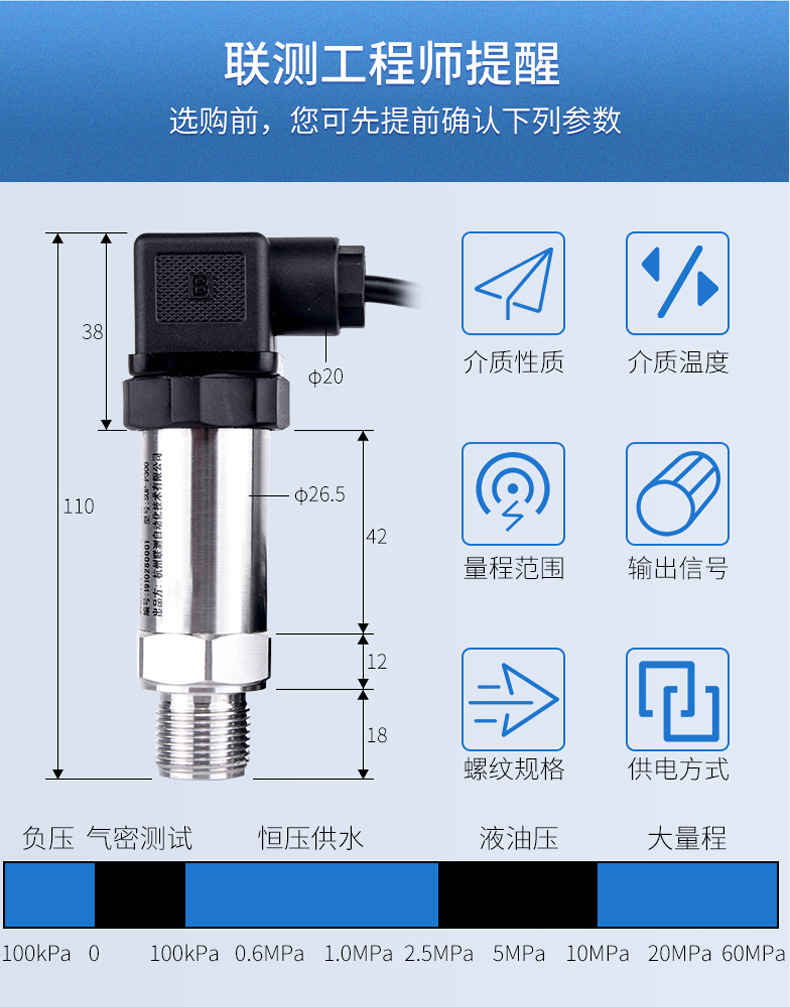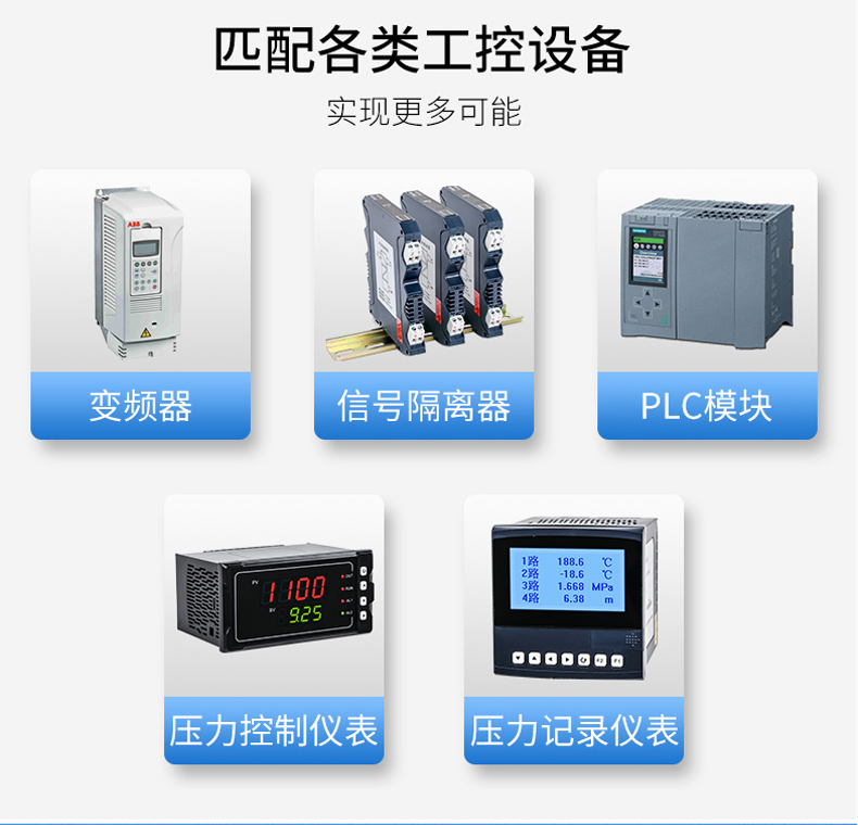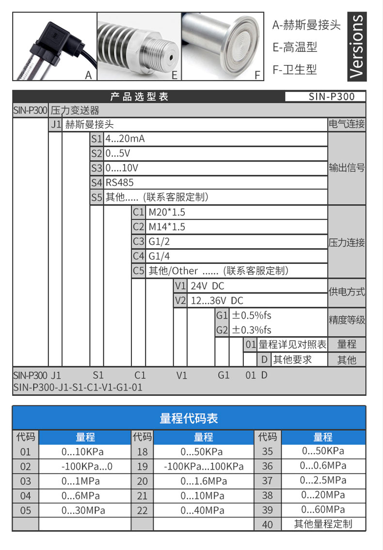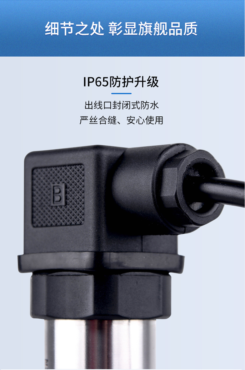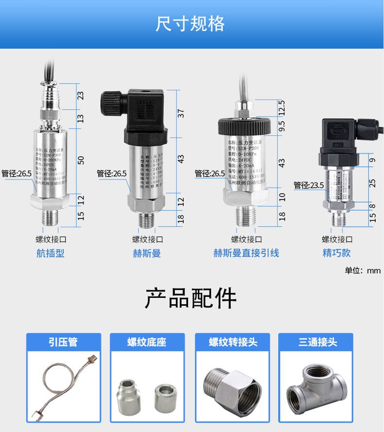 产品简介:SIN-P300通用型压力变送器德国进口硅芯片,精度高性能稳定;SIN-P300型通用型压力变送器采用扩散硅压力芯体作为敏感元件,内置处理电路将传感器毫伏信号转换成标准电压﹑电流信号输出,可直接与计算机、控制仪表﹑显示仪表等相连。