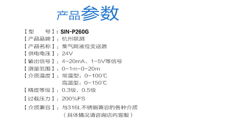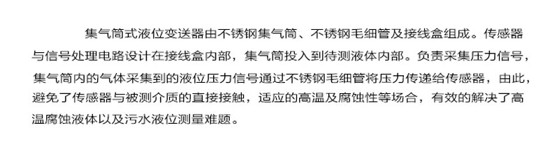 产品简介:集气桶式液位变送器(下称变送器)用于测量较高温度液体介质的液位,原理是被测液体介质压缩集气桶内的空气,空气压力通过毛细管传递给敏感元件,敏感元件本身不与被测介质直接接触,因此变送器可以应用在较高温度的介质环境中,同时,内置微型信号放大处理电路,可以直接与计算机接口卡、控制仪表、智能仪表或 PLC 等连接,进行远程传输。变送器广泛应用于环保、水利、供水、工业过程控制、变频供水等较高温度介质的液位测量。