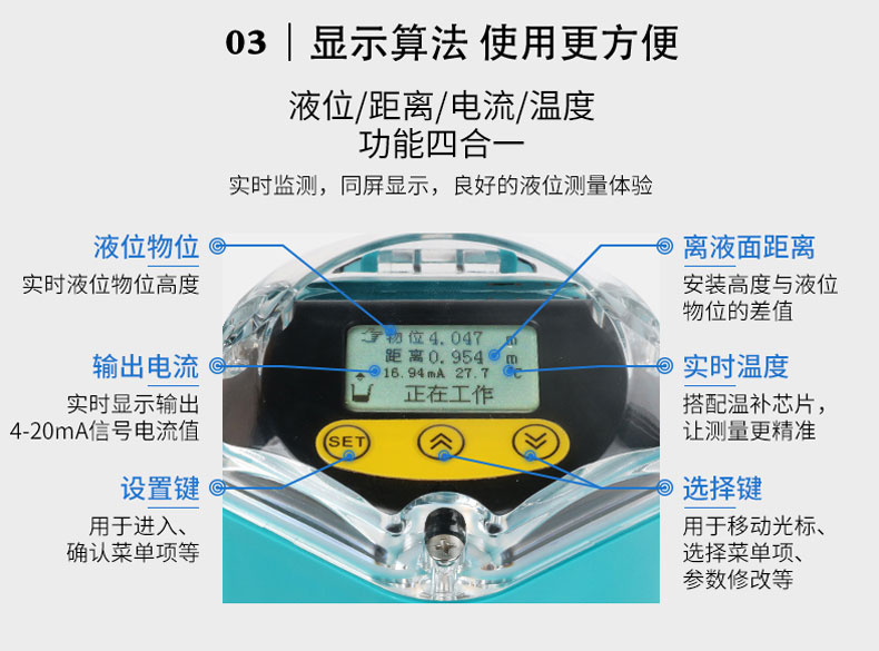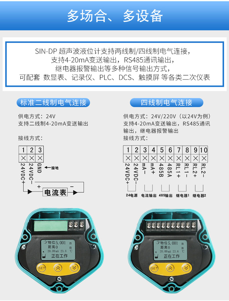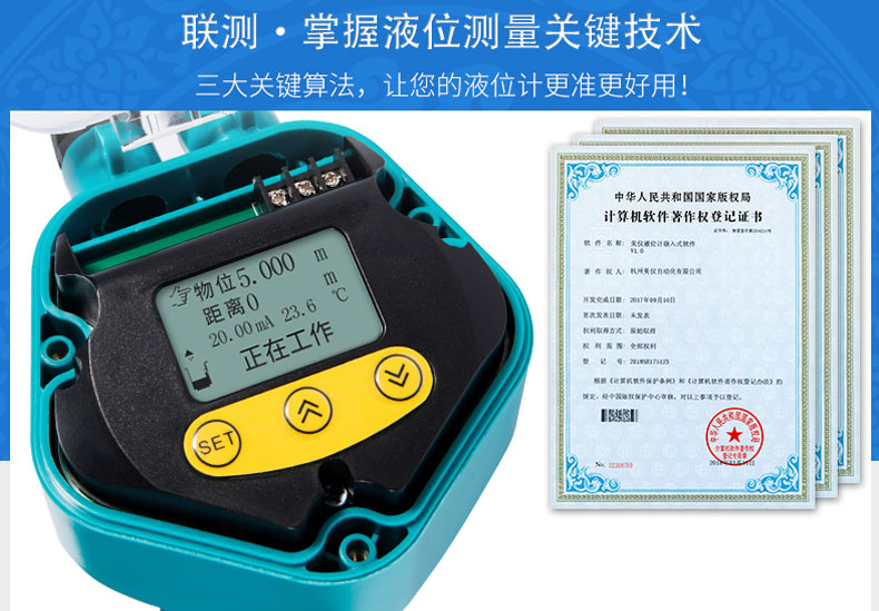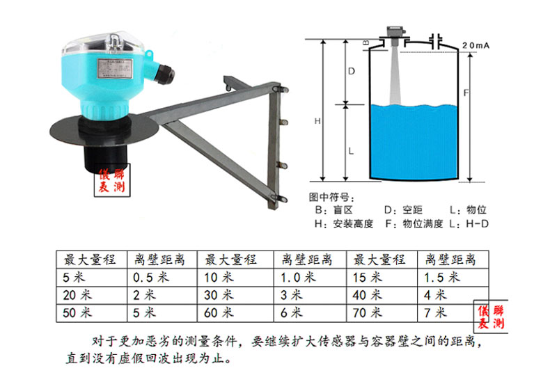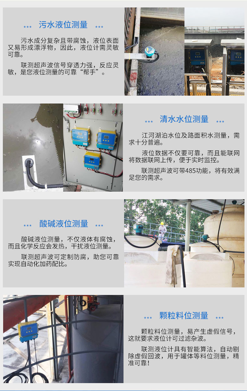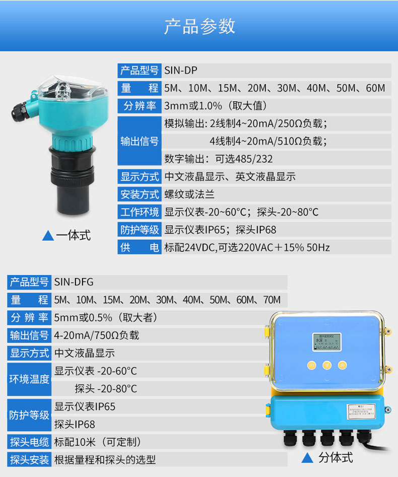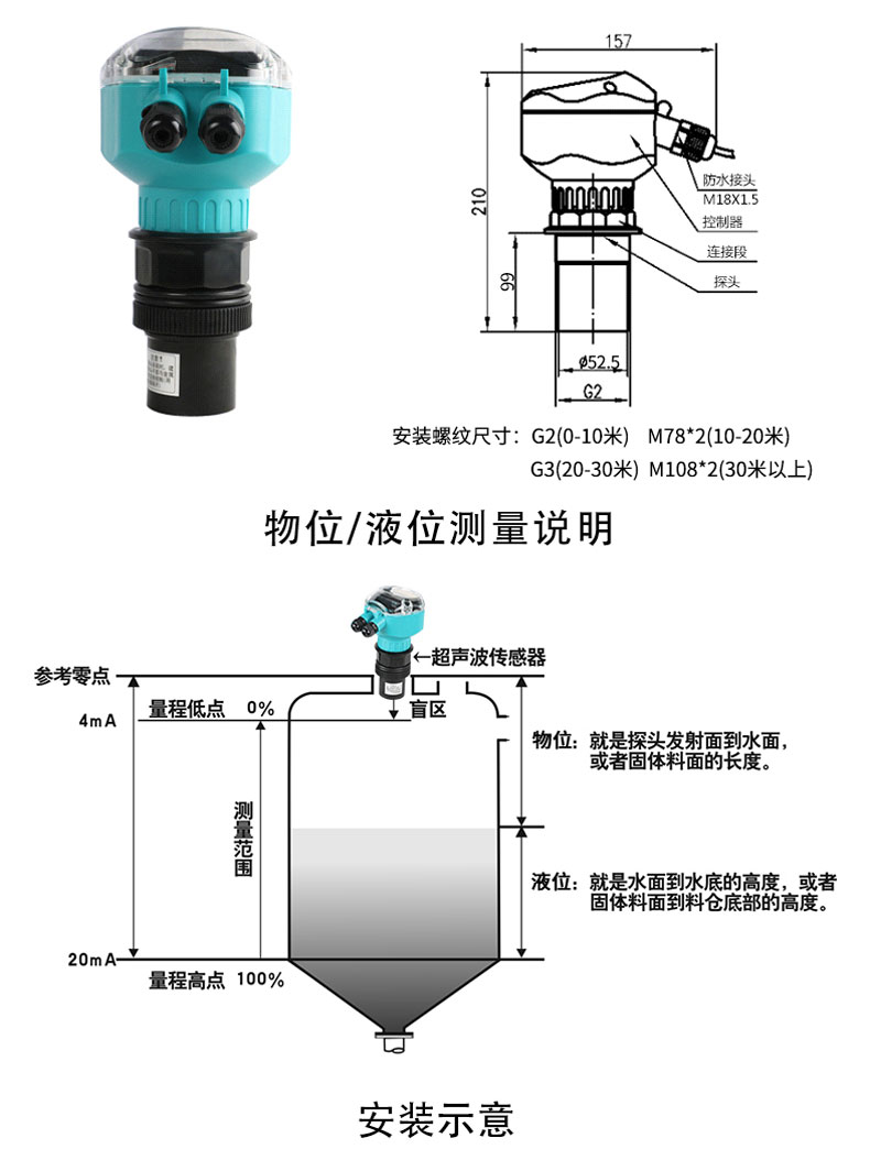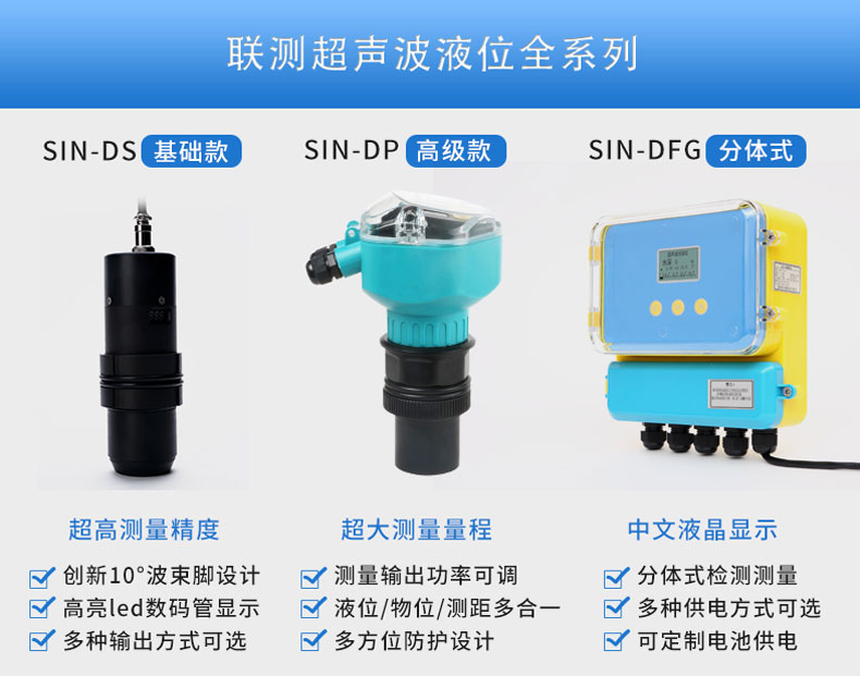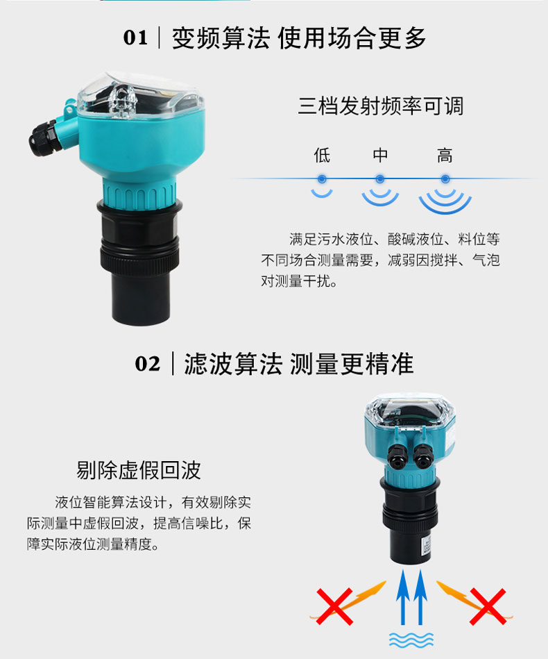 产品简介:在测量中超声波脉冲由传感器(换能器)发出,声波经液体表面反射后被同一传感器接收或超声波接收器,通过压电晶体或磁致伸缩器件转换成电信号,并由声波的发射和接收之间的时间来计算传感器到被测液体表面的距离。 由于采用非接触的测量,被测介质几乎不受限制,可广泛用于各种液体和固体物料高度的测量。