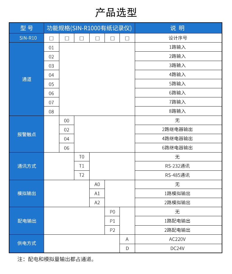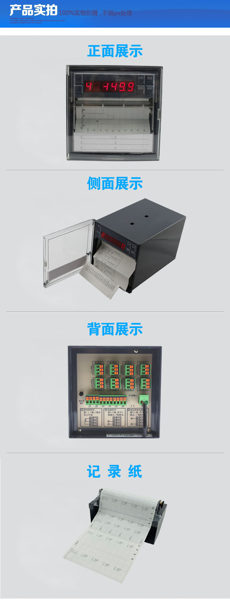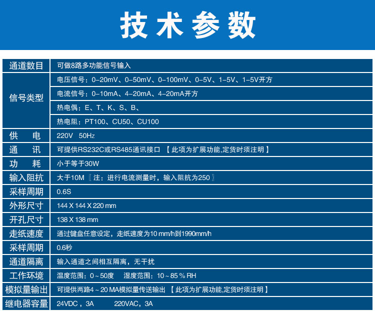 产品简介:SIN-R1000有纸温度记录仪最多具有8路输入通道,2路模拟量输出,通道之间采用点点隔离;均可直接选择接收多种热电偶、热电阻、压力变送器、电压、电流信号,并可对被测信号进行数字显示及进行趋势记录和数字记录,能在本身打印的120mm宽的纸格上同时记录刻度值、时间及每一个信号的曲线,并将通道号印在各通道的轨迹旁。