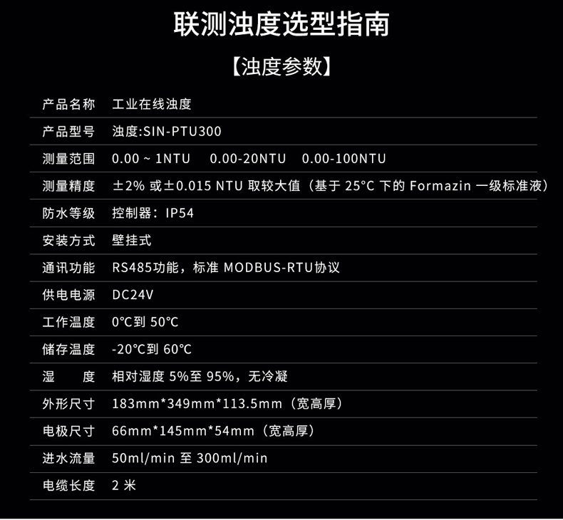 产品简介:联测_SIN-PTU300三个量程段规格,分别为0-1NTU量程段,0-20NTU量程段,0-100NTU量程段,其中0-1NTU量程段主要应用出水浊度低、测量要求高的场合,其最低检出限为0.015NTU,可稳定监测<0.1NTU水质,可配套小型净水设备。